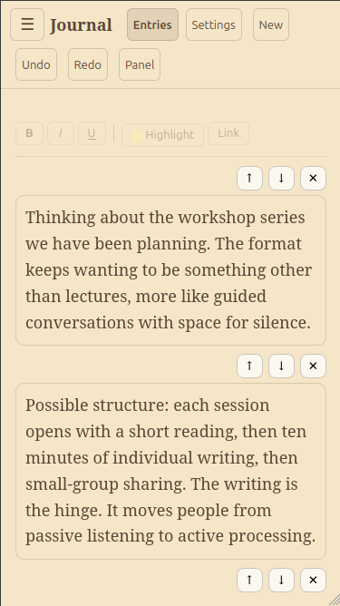 A block-based journaling platform with rich text, images, links, and context-aware writing modes. Encrypted storage with client-derived keys, deterministic entitlements, and no hidden data processing.
